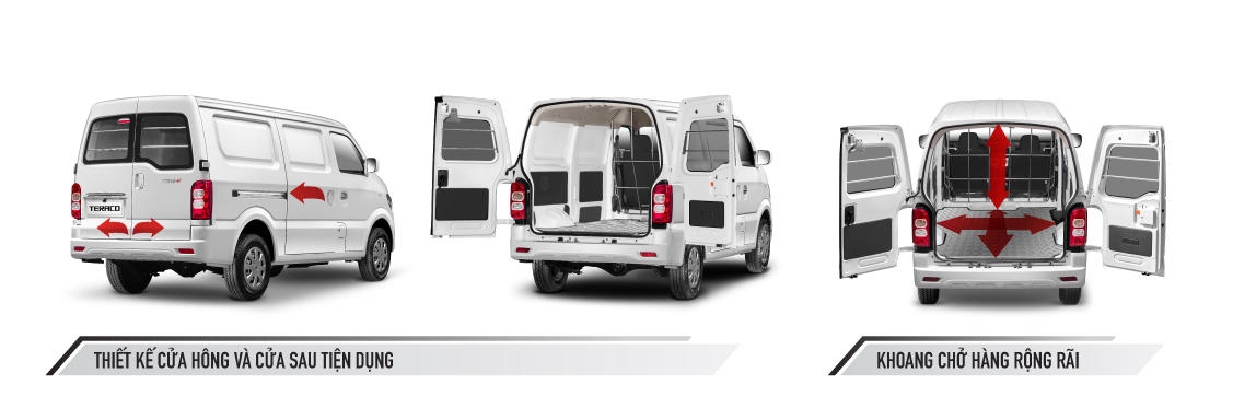 Đặc biệt, TERA-V là dòng ô tô tải van cỡ nhỏ đầu tiên và duy nhất trên thị trường có thiết kế cửa sau dạng 2 cánh mở sang 2 bên – thiết kế chỉ có ở những xe cỡ lớn, thuận tiện cho việc sử dụng xe nâng trong quá trình bốc, dỡ hàng hoá. Xe còn trang bị cửa lùa bên hông, giúp xe tiết kiệm diện tích, phù hợp khi bốc dỡ hàng hóa trong không gian hẹp tại các đô thị lớn. Sàn xe được thiết kế hoàn toàn bằng chất liệu inox được dập vân nổi đầy tính thẩm mỹ và bền bỉ, tăng khả năng chống trượt hàng hóa hiệu quả hơn so với các loại sàn thông thường.