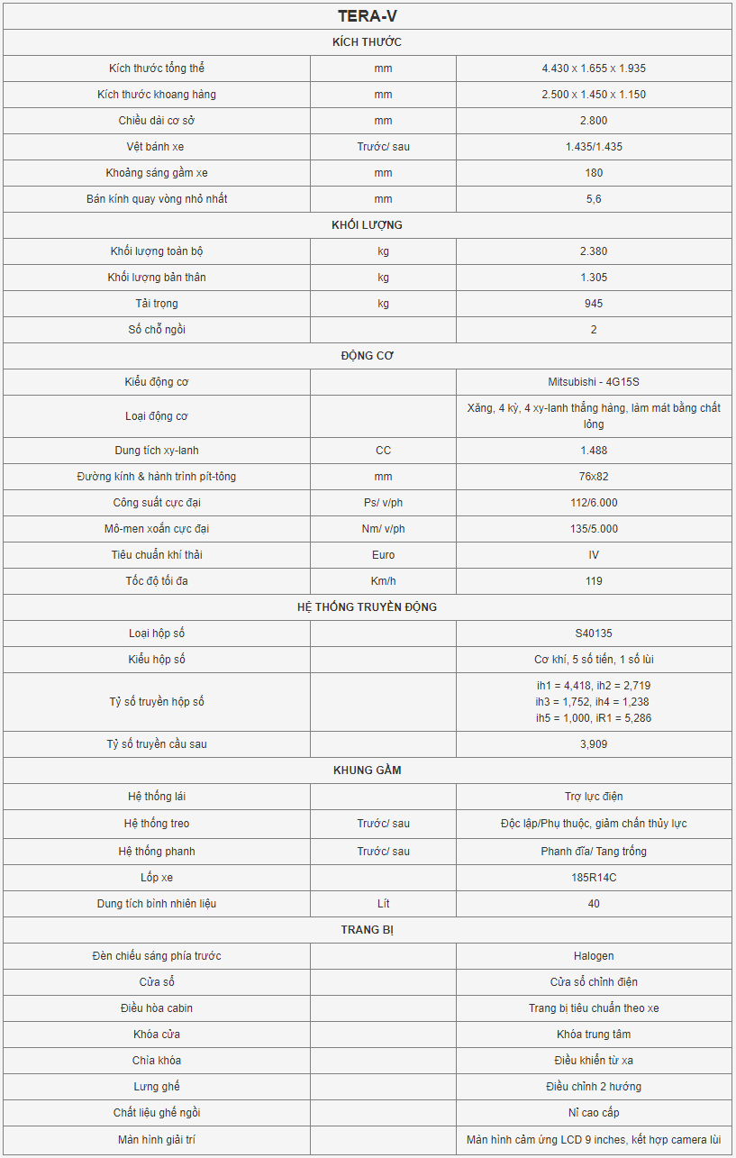 Sở hữu động cơ MITSUBISHI bền bỉ, trang bị nội – ngoại thất tiện nghi, thiết kế hiện đại như một mẫu xe du lịch, kết hợp với khả năng chuyên chở tối ưu và tính di chuyển linh hoạt trong nội ô, TERA-V là xe tải van “thế hệ mới” cho khách hàng Việt.